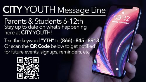 City YTH offers a message line to stay caught up on events, signups, reminders, etc. Text the word "YTH" to (866) - 845 - 8913 or scan the QR code on screen to signup!